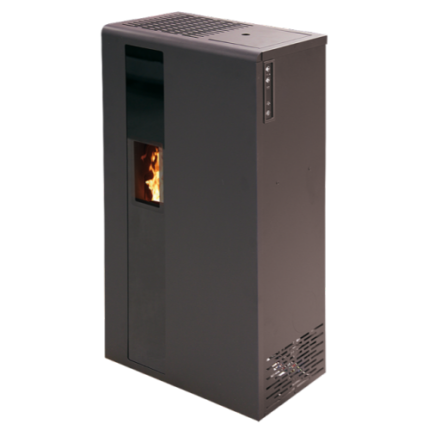 Poêle hydraulique ventilé avec revêtement en acier, dessus en fonte et porte en verre.